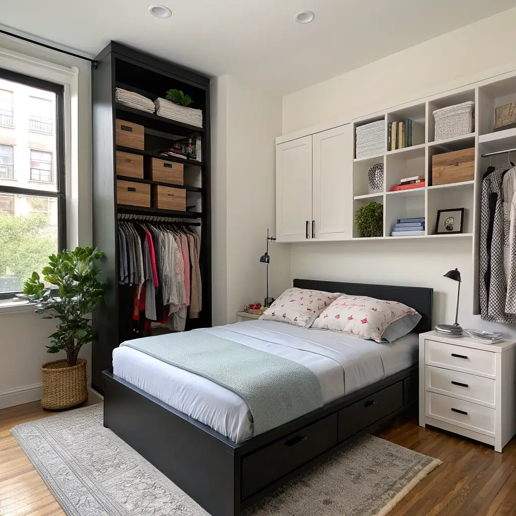 Position your black bed frame strategically to create flow. Mine sits diagonally in the corner, which sounds weird but actually makes my studio feel larger. Sometimes breaking the rules works better than following them.