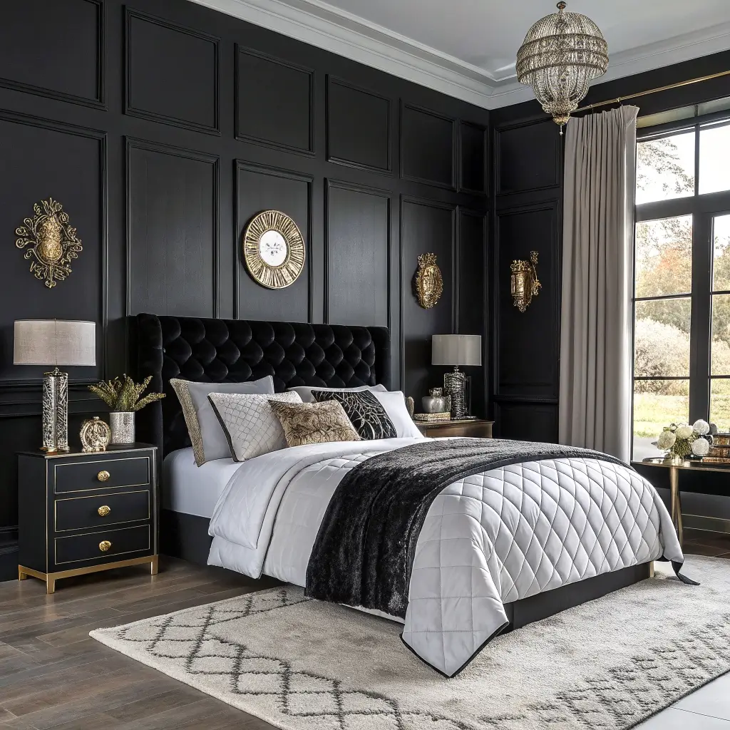 Every list of black bedroom aesthetic ideas needs a glamour moment, and this is it. A black and gold glam suite channels old Hollywood energy — think mirrored surfaces, gold accents, and the kind of drama that makes you want to wear a silk robe and sip champagne while lounging in bed.