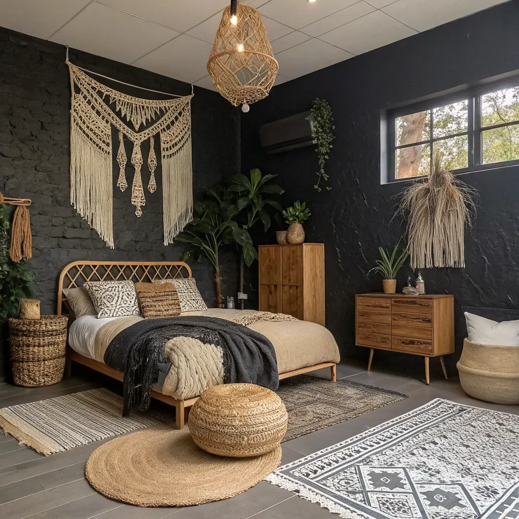 The bohemian spirit centers on collected, layered, globally-inspired design. Translating that into a black bedroom means: