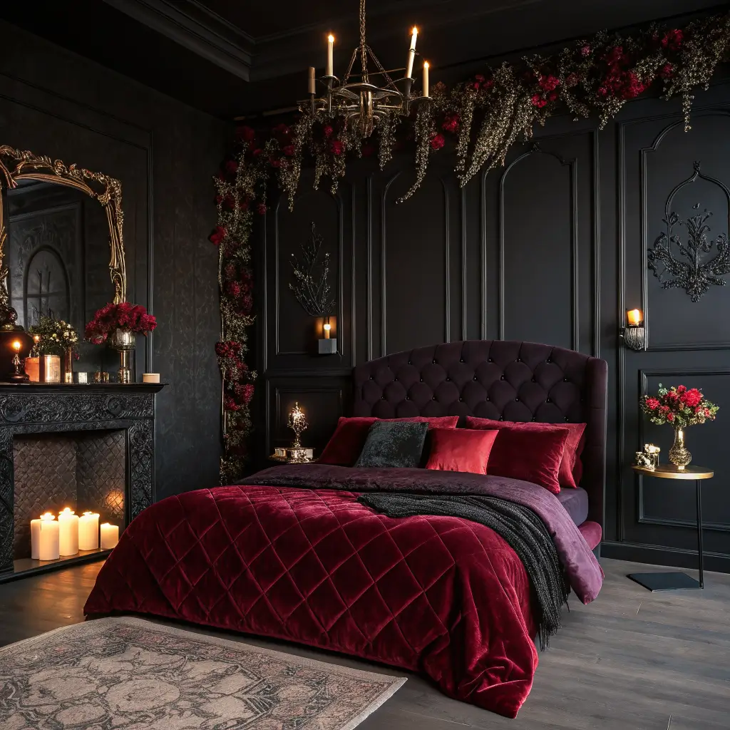 - Arched mirrors or headboards — the pointed arch is quintessentially Gothic and instantly elevates a room