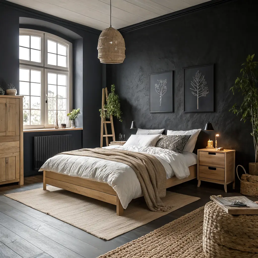 - Natural wood accents — light oak or birch provides beautiful contrast against black walls