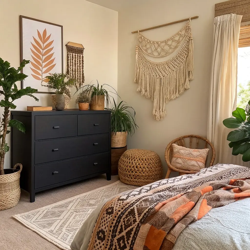 Who says boho can’t include black furniture? A black dresser in a bohemian bedroom creates unexpected sophistication that regular boho sometimes lacks. This isn’t your typical macramé-everything space.