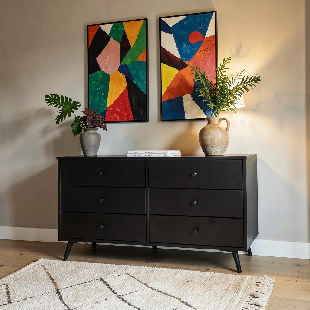 Your black dresser becomes an instant gallery anchor when you hang bold artwork above it. This setup transformed my bedroom from sleeping quarters to personal art museum (minus the admission fee and judgy security guards).