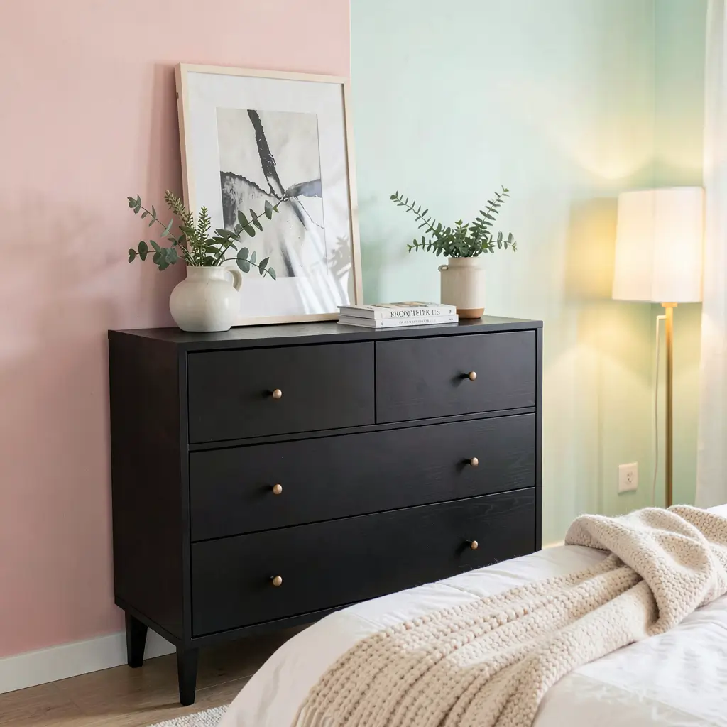 The unexpected benefit? Black dressers make pastels feel grown-up rather than juvenile. Your bedroom can be soft and sophisticated without choosing between them.