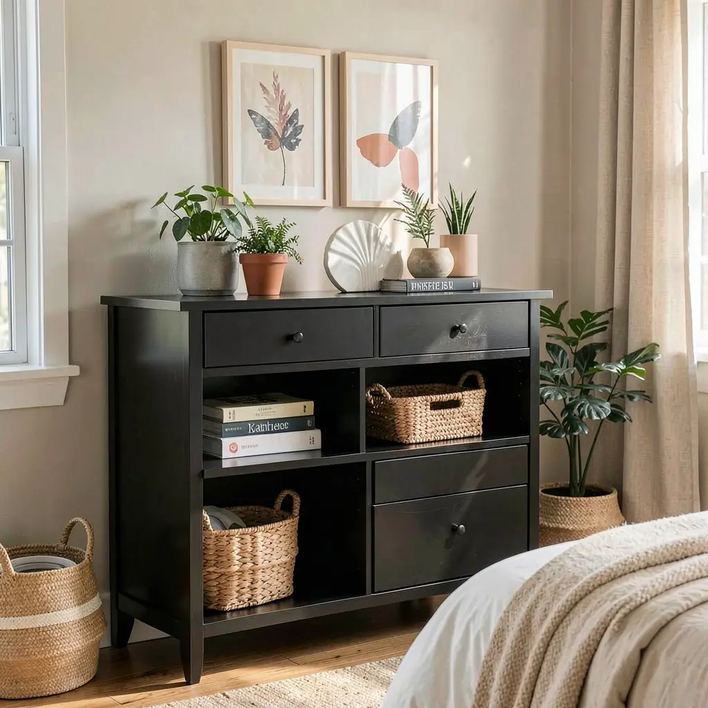Mix textures fearlessly here. The smooth black surface plays beautifully against woven baskets, macramé wall hangings, and fuzzy throw blankets draped nearby. Your dresser becomes the structured element in all that flowing boho energy.