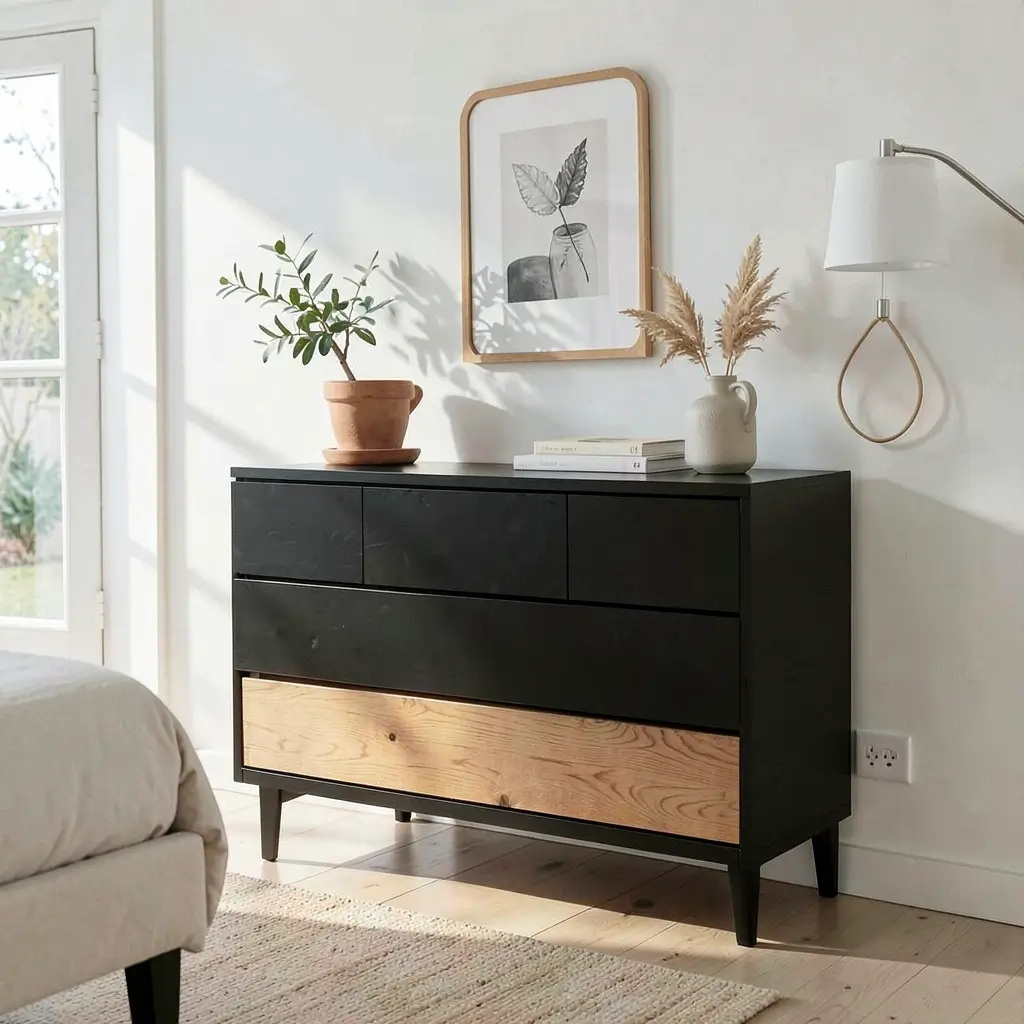 The key to nailing this look? Let each material breathe. Don’t crowd your black dresser with tons of decor. Place a single wooden tray on top, maybe a small succulent in a terracotta pot, and call it done. The beauty lies in what you don’t add.