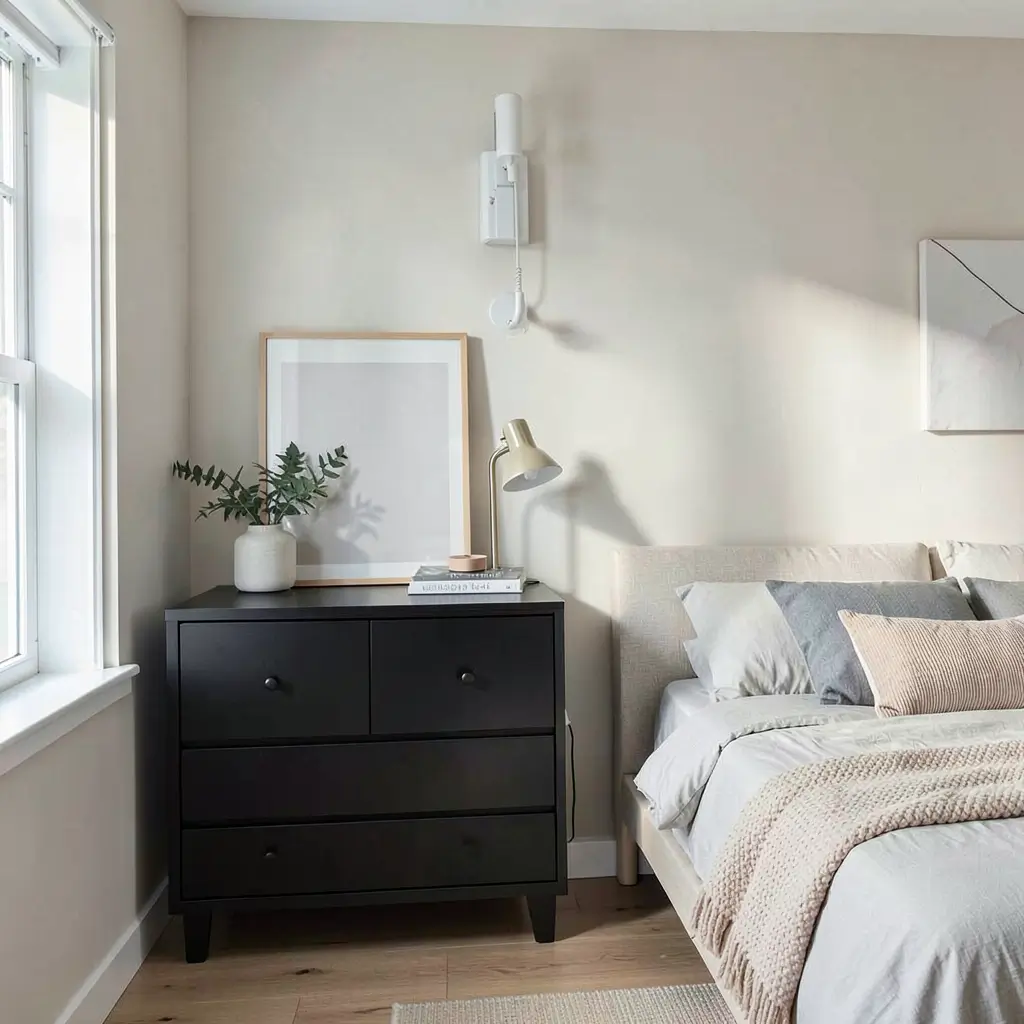 The trick? Keep the area around it clear. A black dresser in a small room needs breathing space to prevent that closed-in feeling. Mine floats about six inches from the wall with nothing beside it, creating the illusion of more floor space.