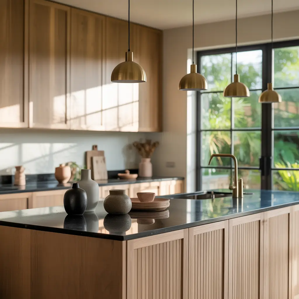 I’m obsessed with pairing black granite with warm brass hardware, honey-toned wood, and cream-colored textiles. The contrast is chef’s kiss. The darkness of the granite actually makes warm tones pop even more, creating this incredible depth that flat, light-colored counters just can’t achieve.