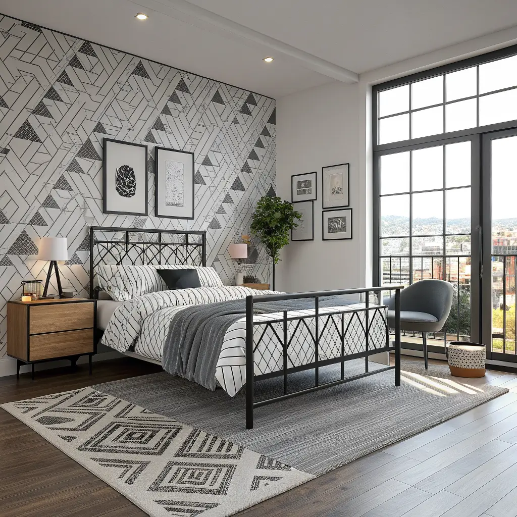 Start with one geometric element – maybe a black and white geometric rug, or grey wallpaper with a subtle geometric print on one accent wall. The key word here is “subtle.” You want patterns that make people look twice, not patterns that assault their eyeballs. Balance is everything in a geometric modern bedroom.