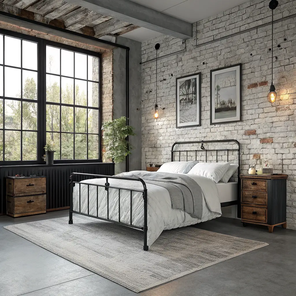 Think exposed brick painted white (or left natural grey), black metal bed frames that look like they belong in a converted warehouse, and grey concrete elements that add that raw, unfinished vibe. The beauty of industrial style? It embraces imperfection. That slightly uneven wall? Feature it. Those visible pipes? Paint them matte black and call them decoration.