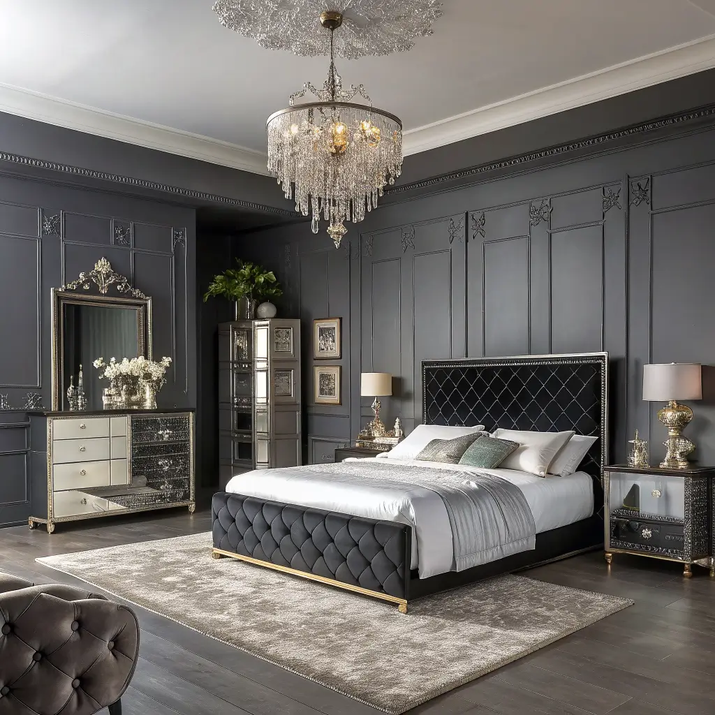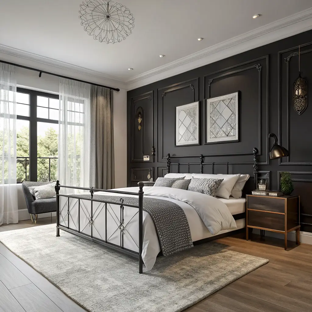 Here’s where we bend the rules just a tiny bit – adding metallic accents to our monochrome palette for that moody glam effect. Think dark grey walls, black furniture, white bedding, and then – plot twist – silver or gunmetal metallic touches that catch the light and add magic.