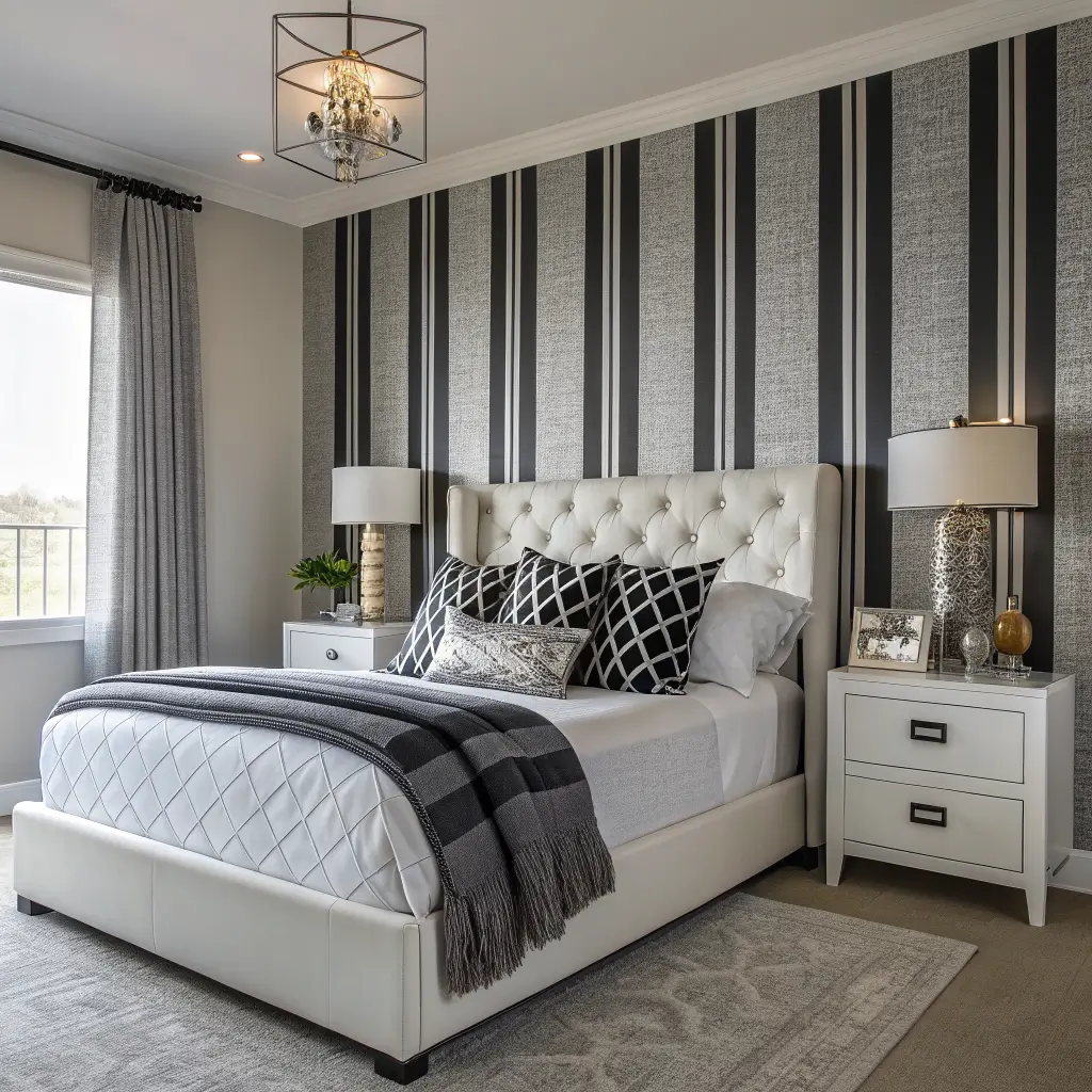 Consider wide grey and white stripes on an accent wall – they add height and interest without overwhelming the space. Or go subtle with pinstriped grey bedding that adds texture you can only see up close. Black stripes should be used sparingly – maybe in a throw pillow or small rug – unless you want your bedroom to look like a referee’s uniform.
