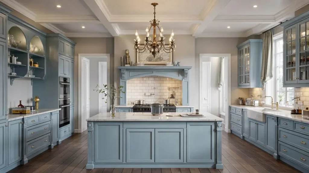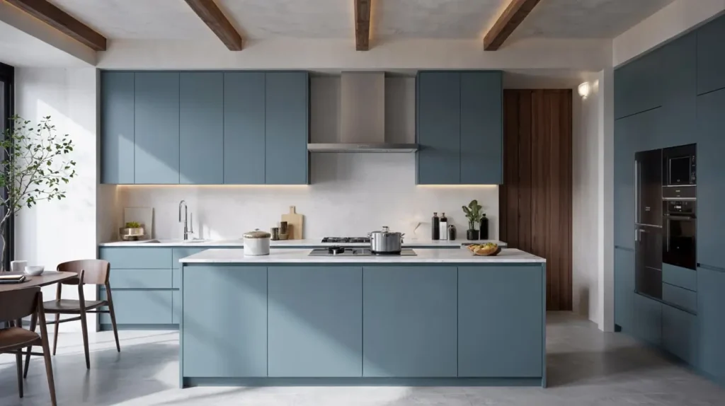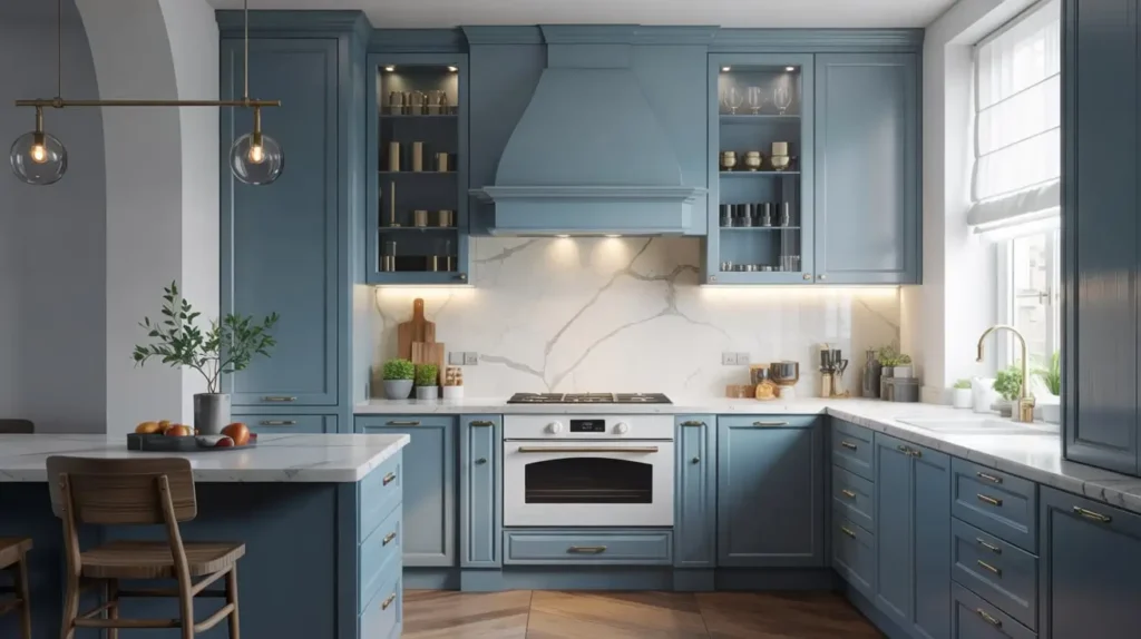 In this style, you’ll typically see flat-panel cabinet doors, integrated handles, and hardware-free designs. The blue might appear as a bold statement wall, sleek island, or even just the subtle tint in a marble backsplash.