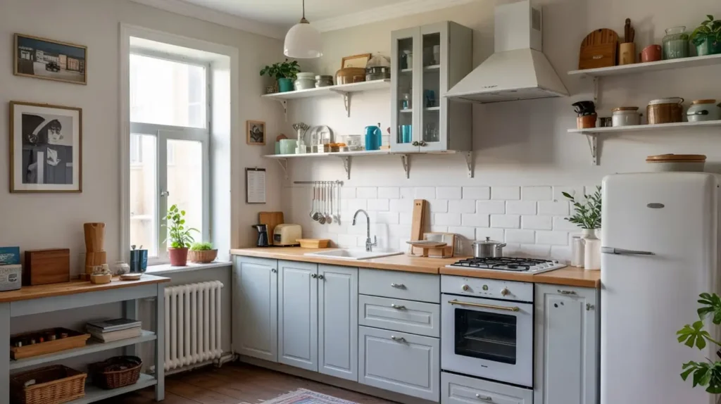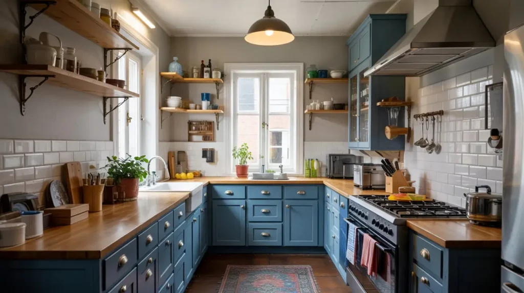 Light blue reflects natural light beautifully, making compact spaces feel larger and more open. Pair it with white countertops, white tile, and light-colored flooring, and suddenly your galley kitchen doesn’t feel like a closet anymore.