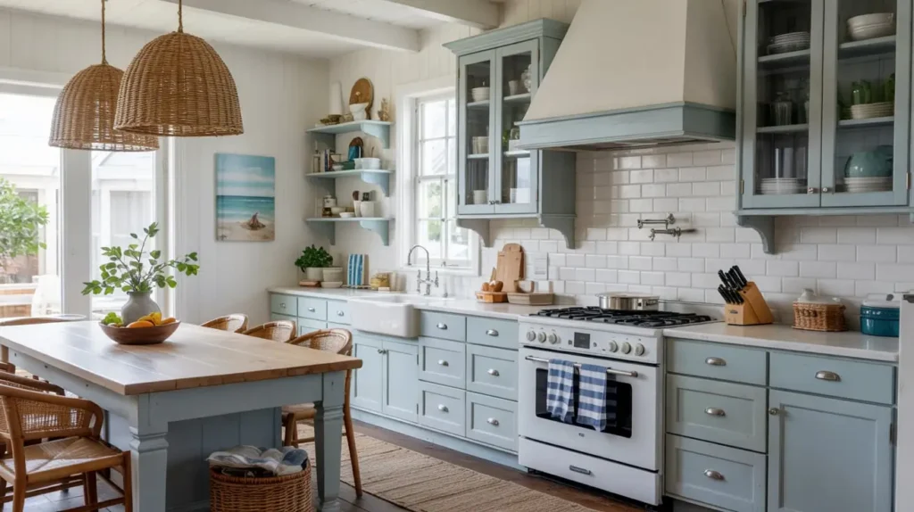 Think weathered wood elements, natural textures, and those soft, ocean-inspired blue tones that make you want to pour a glass of lemonade and listen to waves crash. Even if you live in the middle of Kansas, you can achieve this relaxed, breezy atmosphere.