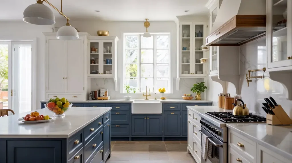 Layer different shades: Use varying tones of blue and white to add depth without adding clutter. A matte navy island against white lacquer cabinets creates interest while maintaining simplicity.