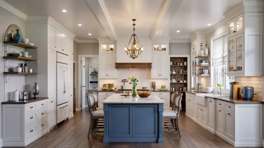Raised panel cabinet doors, crown molding details, and furniture-style feet on islands define this aesthetic. Add blue and white, and you’ve created a kitchen that could grace the pages of a design magazine from any decade.
