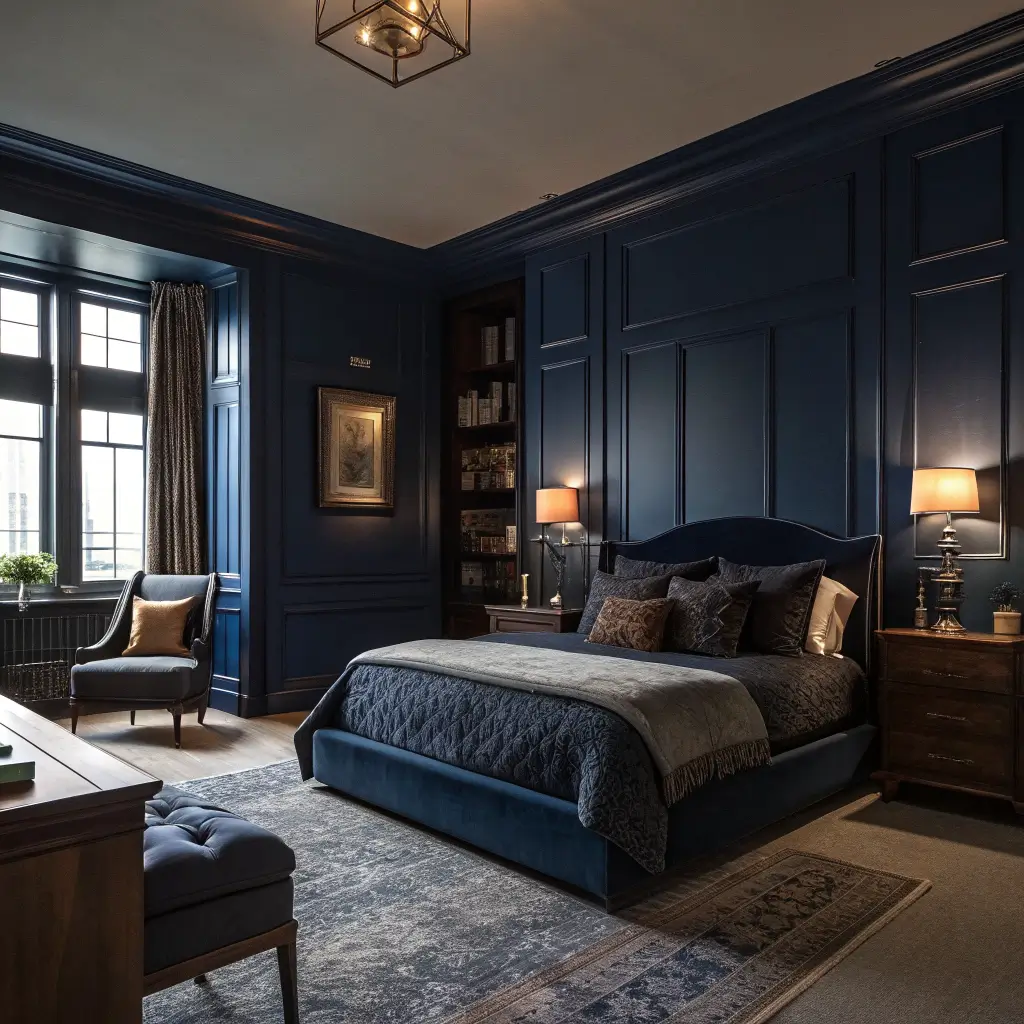 - Dark wood furniture — Walnut or mahogany complements navy beautifully