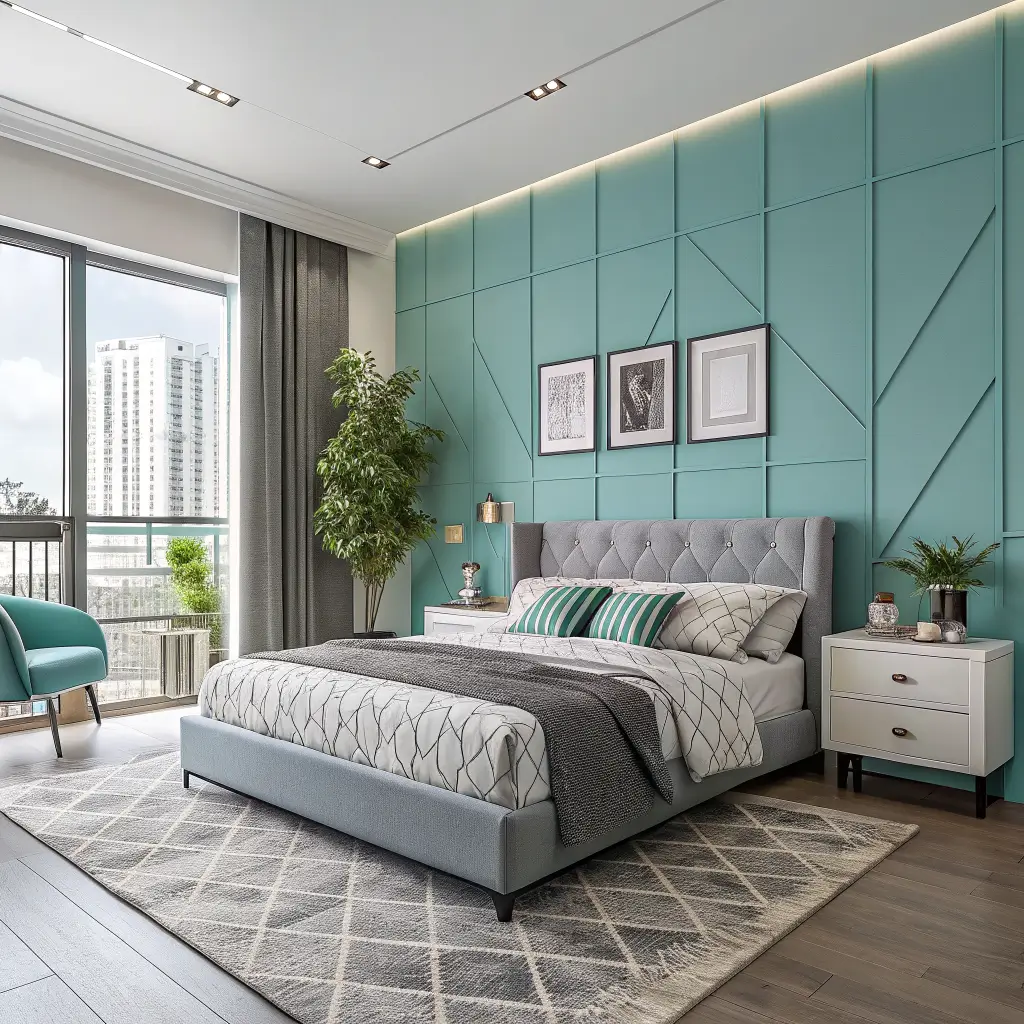 Aqua and gray is one of those color pairings that feels effortlessly modern. Neither color fights for dominance; instead, they complement each other beautifully. Gray provides the sophisticated, grounded base, while aqua injects freshness and energy. Together, they create a master bedroom that feels current without chasing trends.