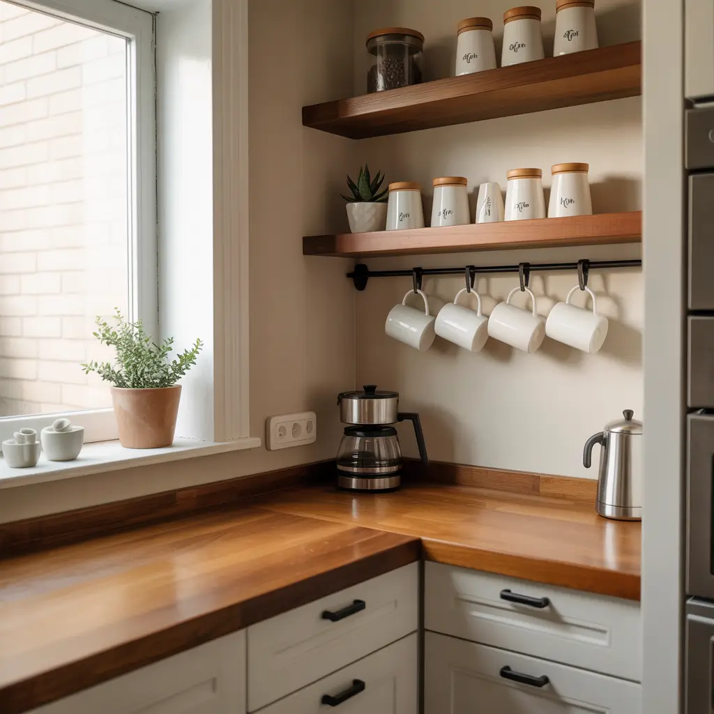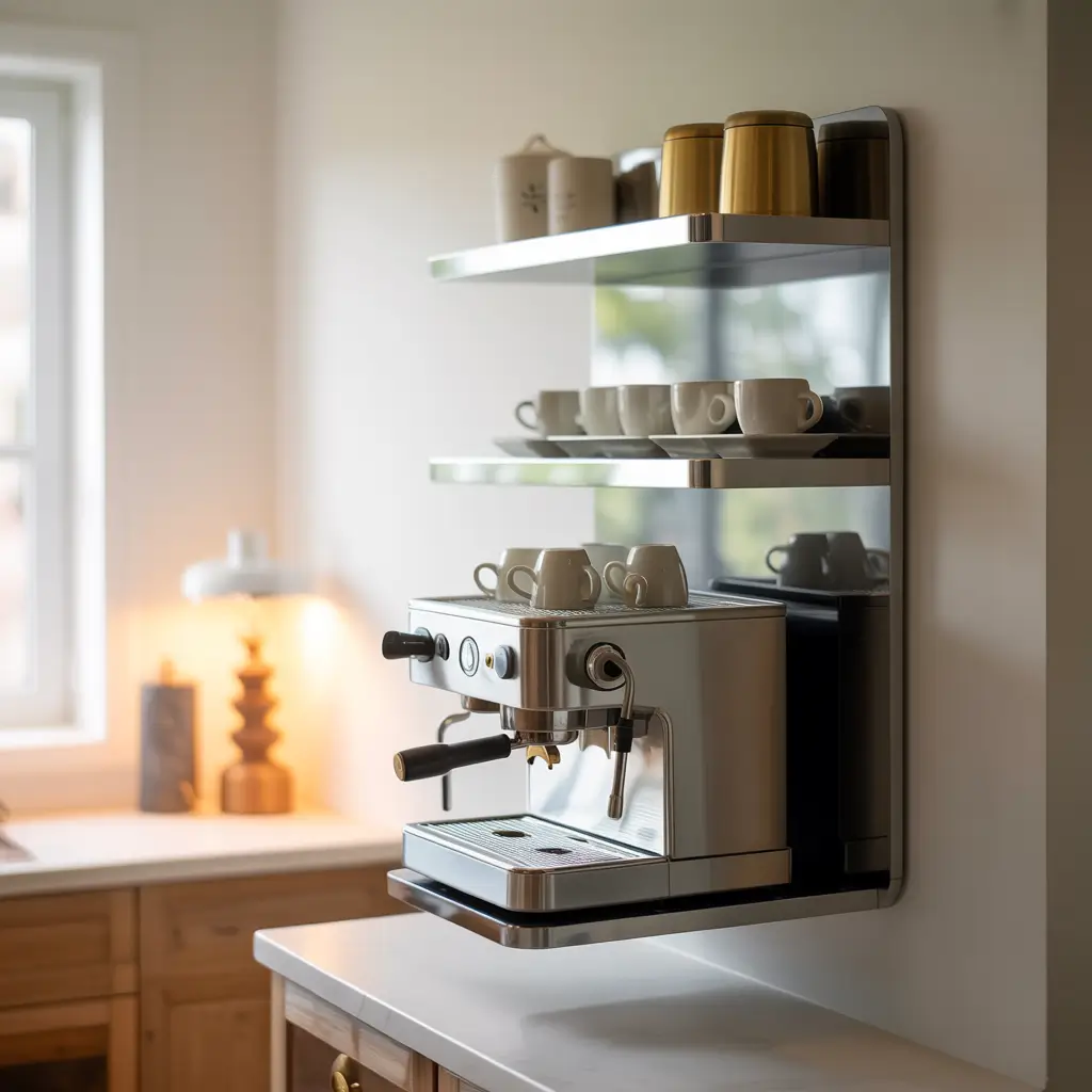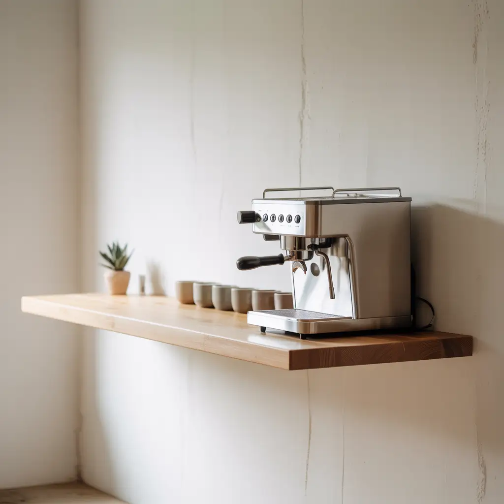 I experimented with this in a tiny rental kitchen, and it was a game-changer. I mounted a floating shelf strong enough to hold my espresso machine, added hooks underneath for mugs, and installed a small shelf above for beans and supplies. The whole setup occupied about two square feet of wall space and zero counter space.