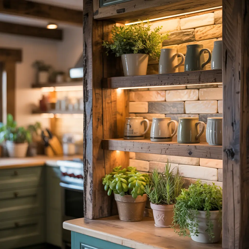 Ever walked into one of those farmhouse-style homes and felt immediately cozier? That’s the vibe we’re chasing here. The rustic farmhouse coffee nook combines reclaimed wood, open shelving, and that lived-in charm that makes you want to curl up with a latte and a good book.