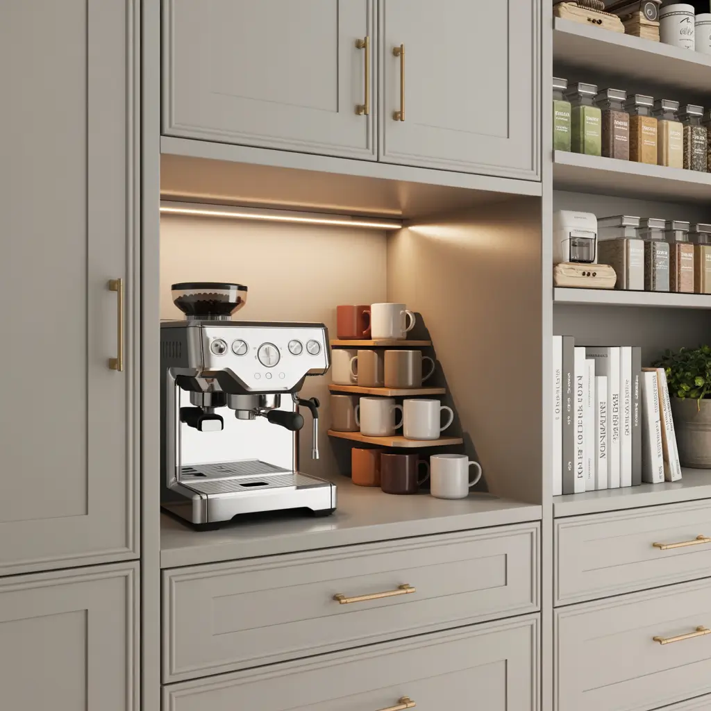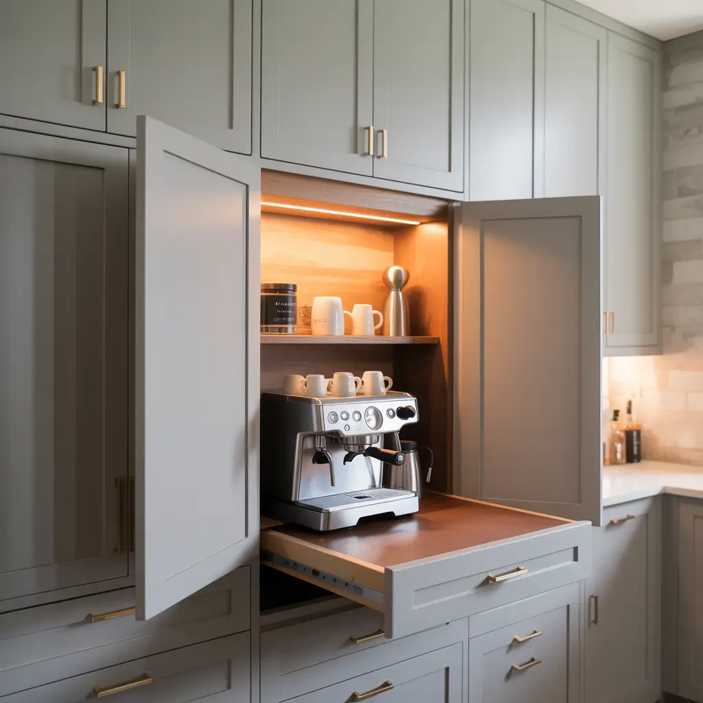 Picture this: smooth, handleless cabinet doors that blend seamlessly with your kitchen cabinetry. You press one, and it pops open to reveal your entire coffee operation—machine, grinder, accessories, the works. When you’re done brewing, you close it up, and poof, it’s like your coffee station never existed.