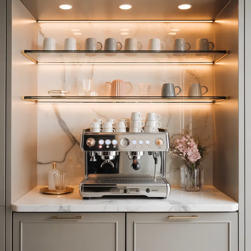 The contemporary LED-lit coffee bar pairs beautifully with modern design—sleek cabinets, glossy finishes, and minimalist accessories. The lighting becomes part of the design language, not just a functional add-on.