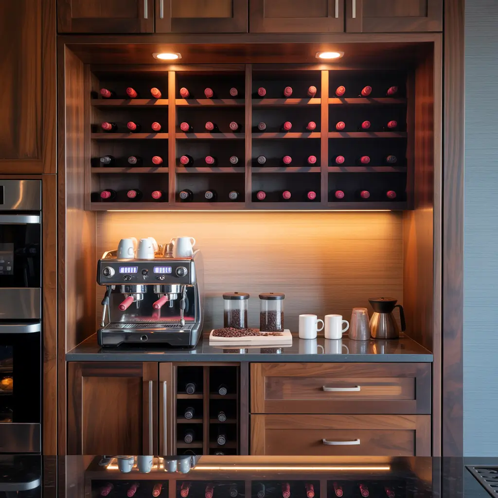 I’ve seen this executed brilliantly in open-concept kitchens where the bar becomes a focal point. The upper section houses coffee supplies—machine, mugs, grinder, beans. The lower section features wine bottle storage, stemware racks, and maybe a small fridge. It’s like having a full beverage center in one cohesive unit.
