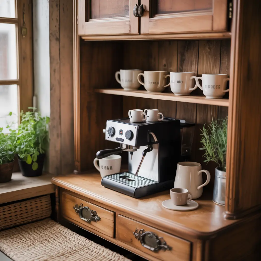 The beauty of vintage furniture is that every piece is unique. Your coffee bar won’t look like everyone else’s cookie-cutter setup. You might find an old Hoosier cabinet, a mid-century credenza, or a farmhouse hutch—each brings its own personality to your kitchen.