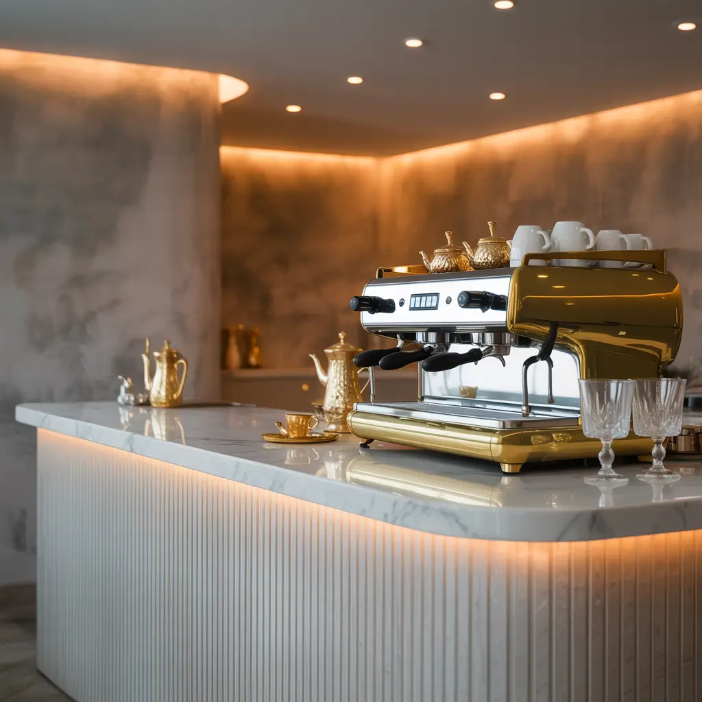 Pair this with some gold or rose gold accents—think a fancy-looking kettle, metallic spoons, or gold-rimmed cups—and you’ve created a luxury hotel vibe. I splurged on one really nice espresso machine (okay, it was my birthday present to myself) and placed it on my faux-marble surface. Every morning feels like a treat.