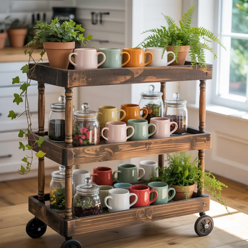 The key is organizing it strategically. I keep my coffee maker on top (make sure your cart is sturdy enough!), coffee and tea supplies on the middle shelf, and mugs and accessories on the bottom. Some carts even come with hooks on the sides for hanging mugs or towels.