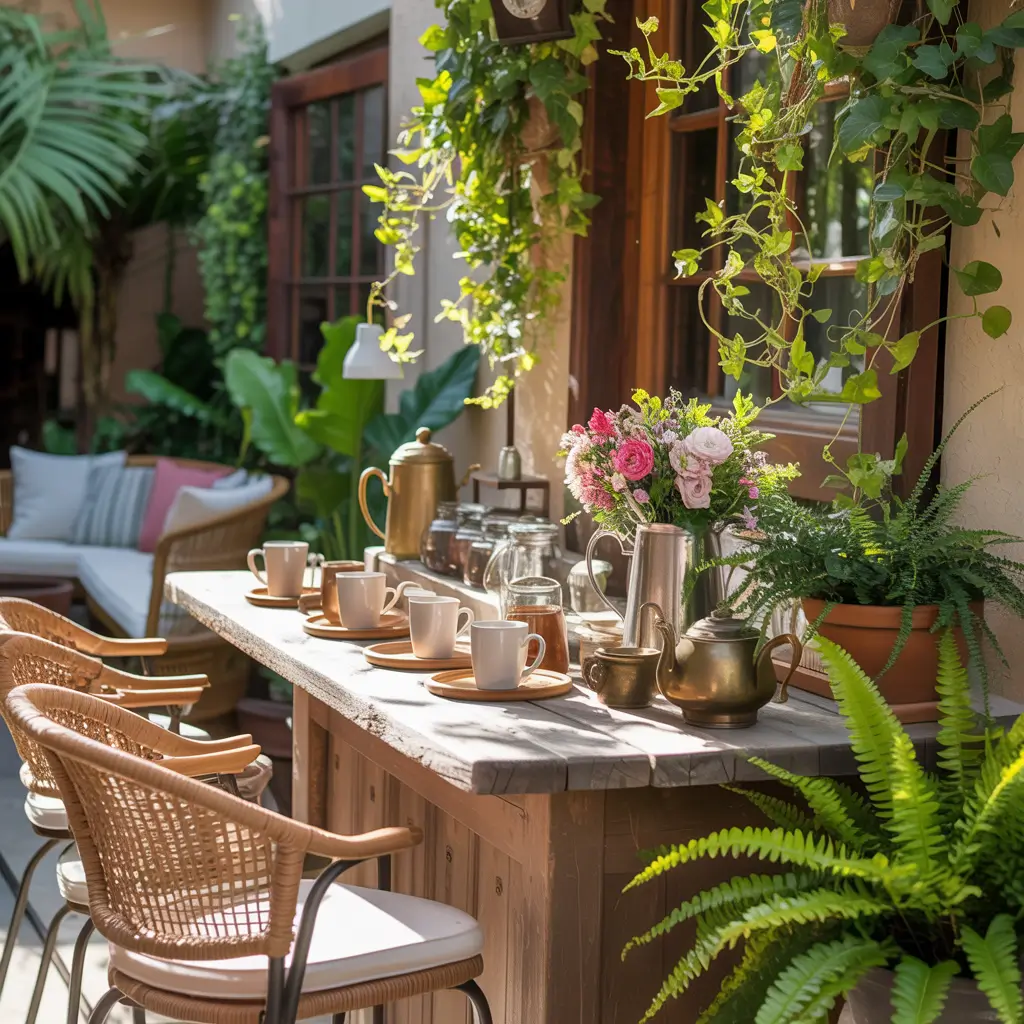 I set up a small outdoor coffee bar on my balcony using a weatherproof cart and a French press. On weekend mornings, I make my coffee outside while watching the sunrise, and it’s honestly one of my favorite rituals. You don’t need much—just the basics that can withstand outdoor conditions.