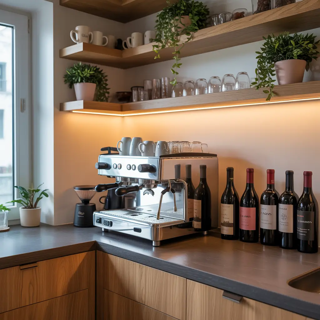 Picture this: one sleek floating shelf, white or light wood. Your espresso machine sits there like a piece of art. Three wine bottles max, displayed like you curated them (you did—you like them). Two perfect wine glasses. Your favorite mug. That’s it.