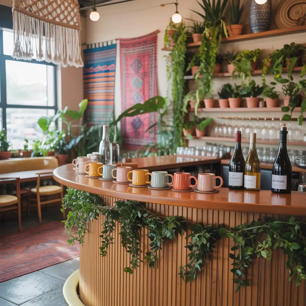 Eclectic, colorful, and unapologetically personal. The bohemian approach to a coffee and wine bar lets you break every design “rule” and somehow make it work. I love this style because it celebrates individuality—your bar won’t look like anyone else’s, and that’s exactly the point.