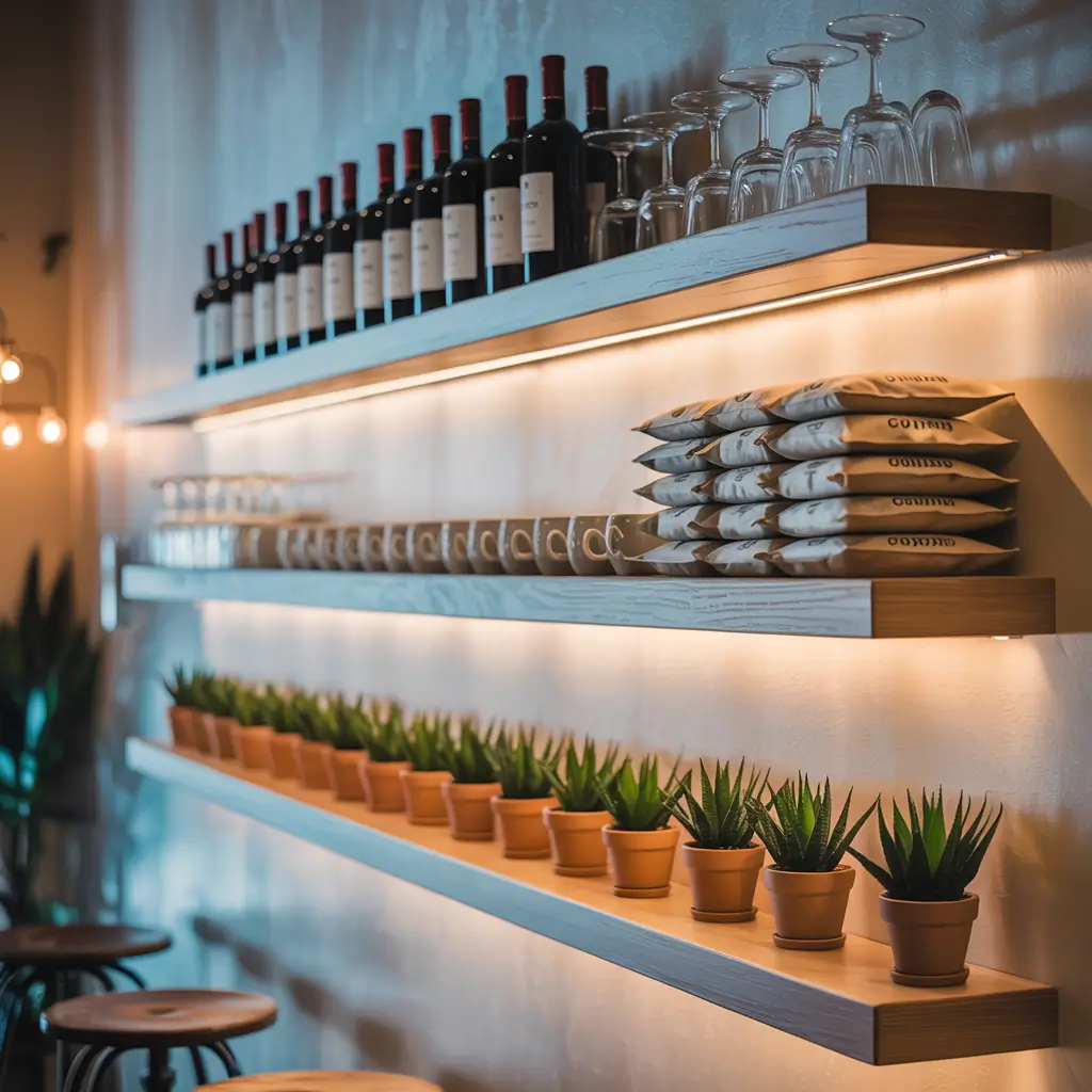 Styling floating shelves requires balance. I follow the rule of thirds—one-third coffee stuff, one-third wine items, one-third decorative (plants, small art, interesting objects). Leave some empty space too; overcrowding defeats the floating effect.