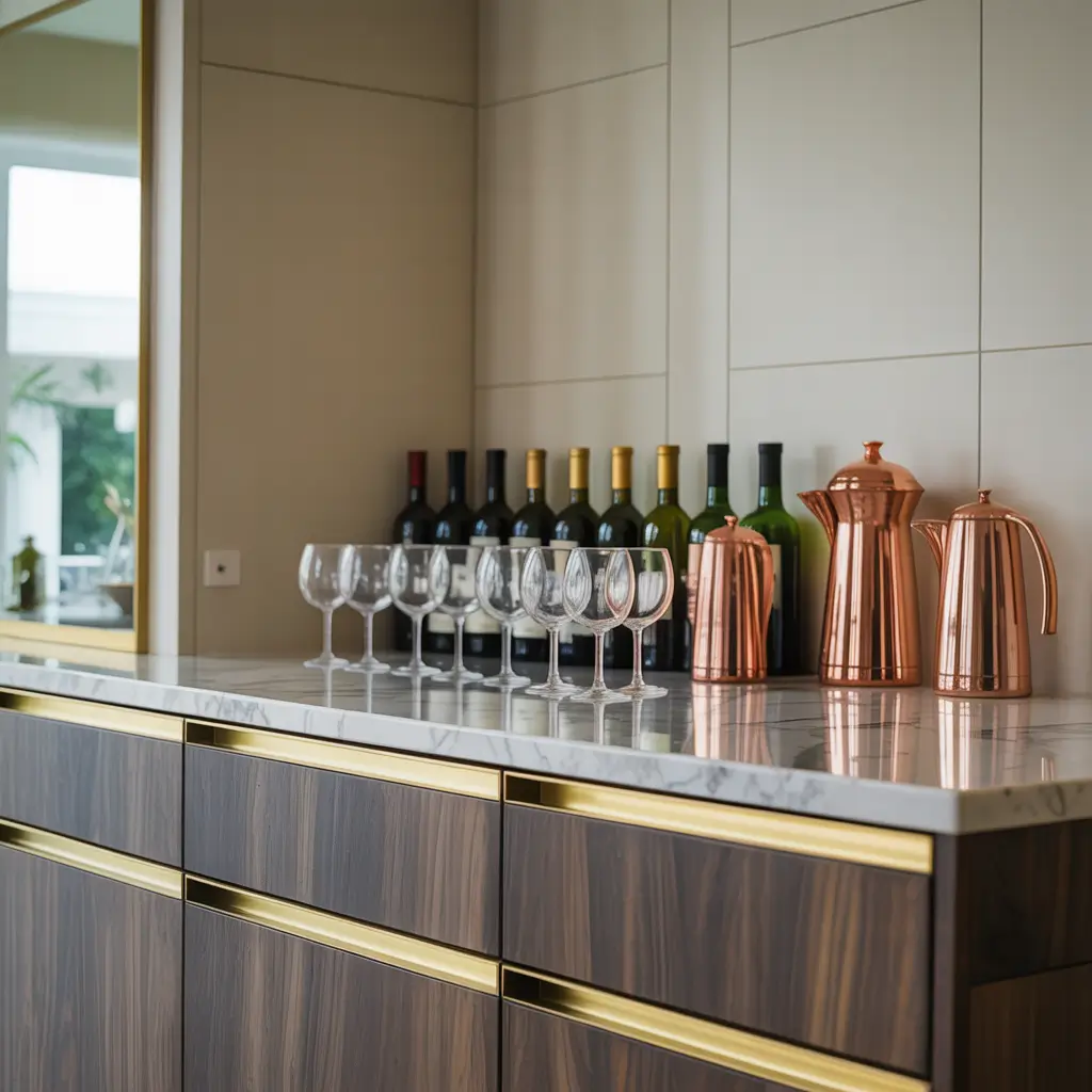 The reflective surfaces multiply everything visually, which means you need fewer items to create impact. I keep my modern bar intentionally spare—a gorgeous espresso machine, three wine bottles in a geometric metal holder, essential glassware, and a single statement plant (currently a sculptural succulent).