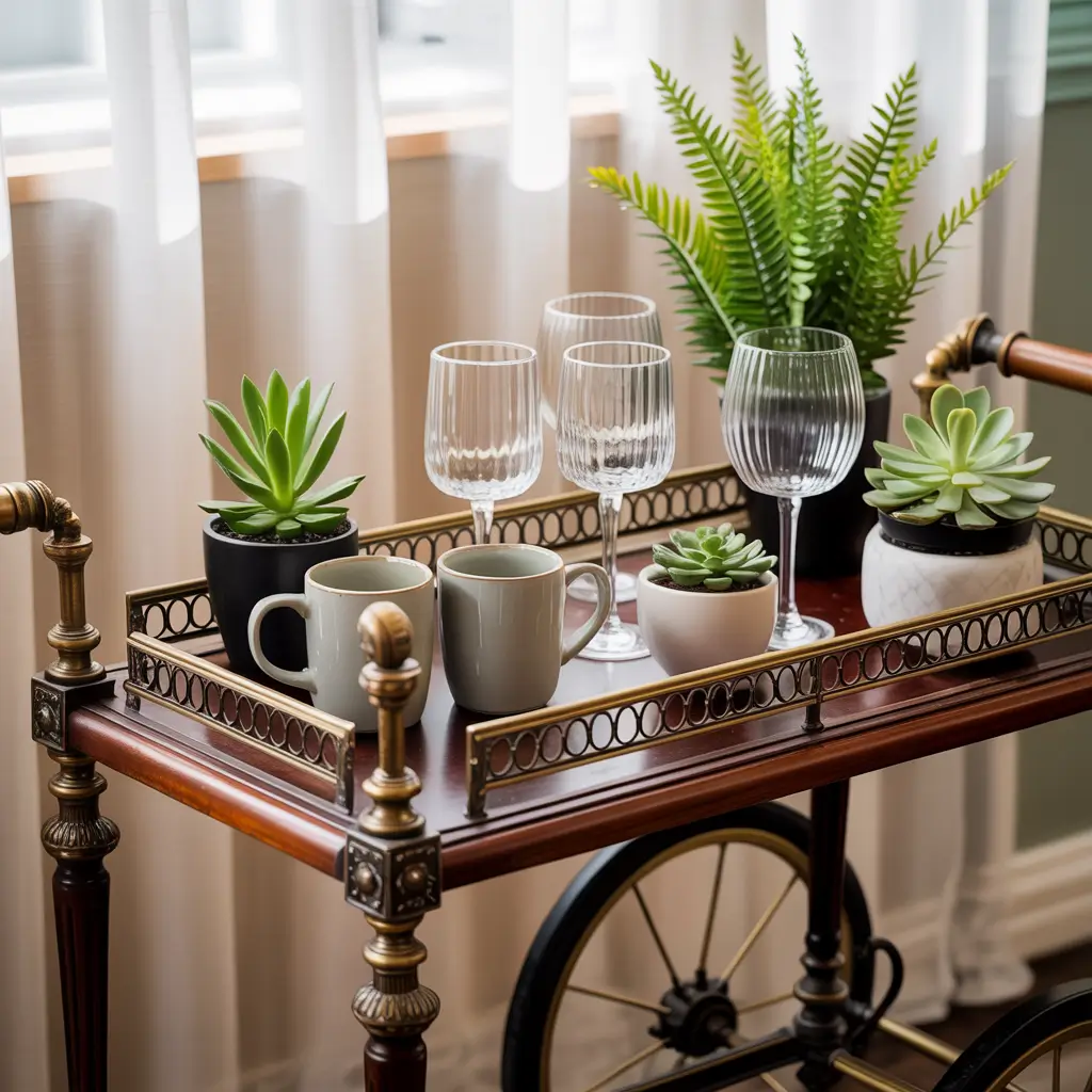 I use a three-tiered plant stand as the foundation, with coffee equipment on one tier, wine on another, and plants on the third. Additional trailing plants cascade from wall-mounted planters above. The effect is lush and jungle-like, but contained to one corner of my kitchen.