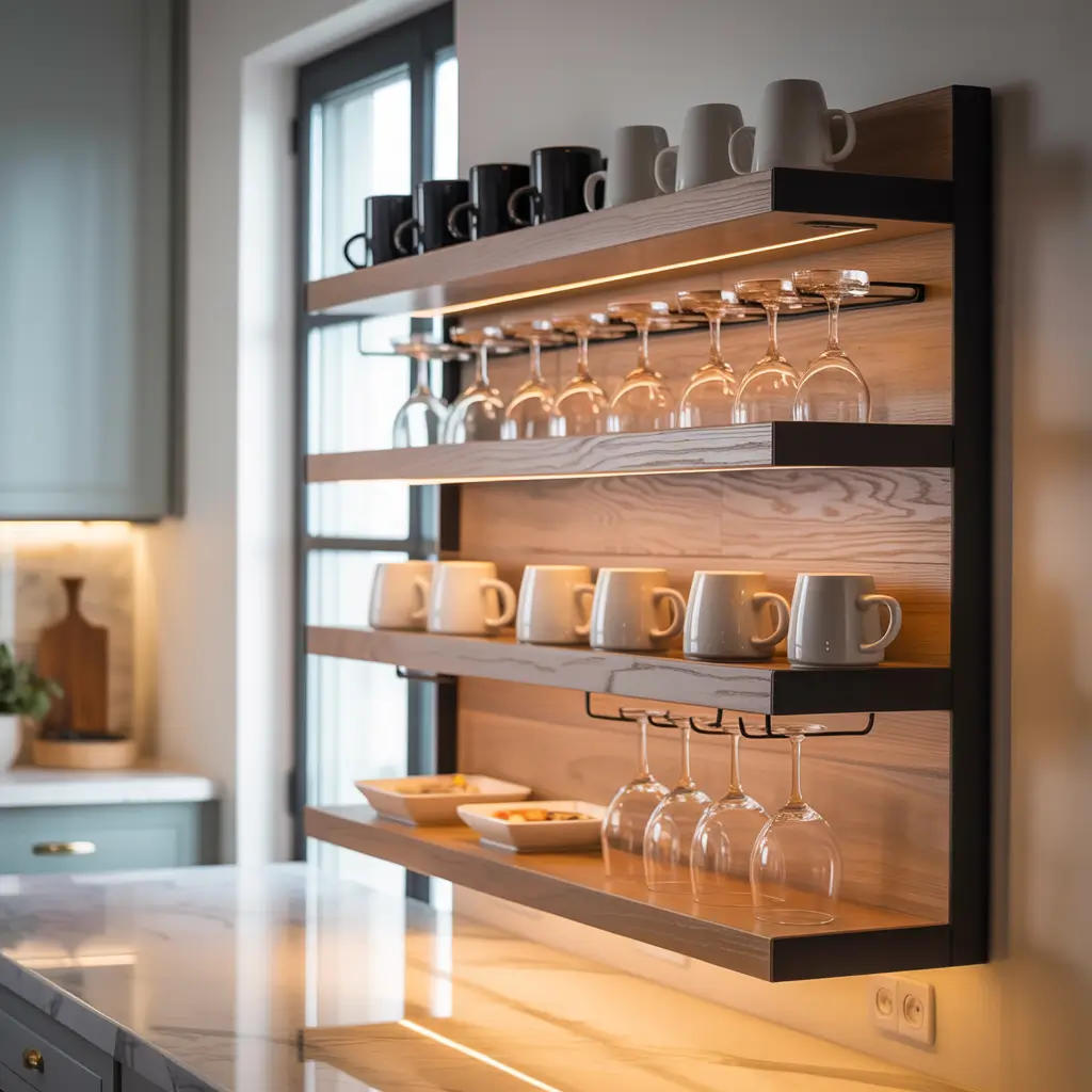 I installed a custom wall-mounted rack in my kitchen that combines wine bottle storage, wine glass holders, coffee mug hooks, and a small shelf for my coffee maker. It transformed a blank wall into a practical café-meets-wine-bar situation.