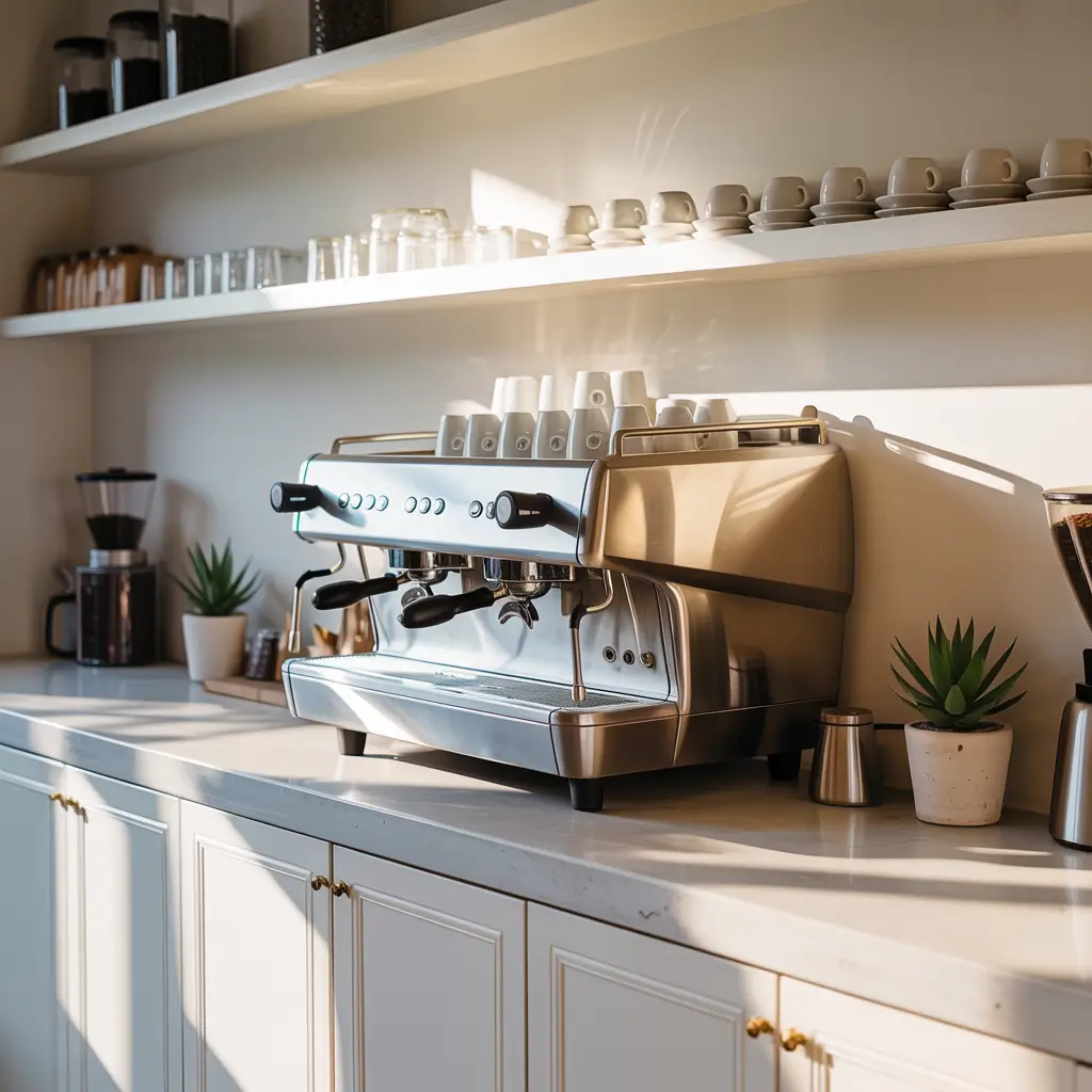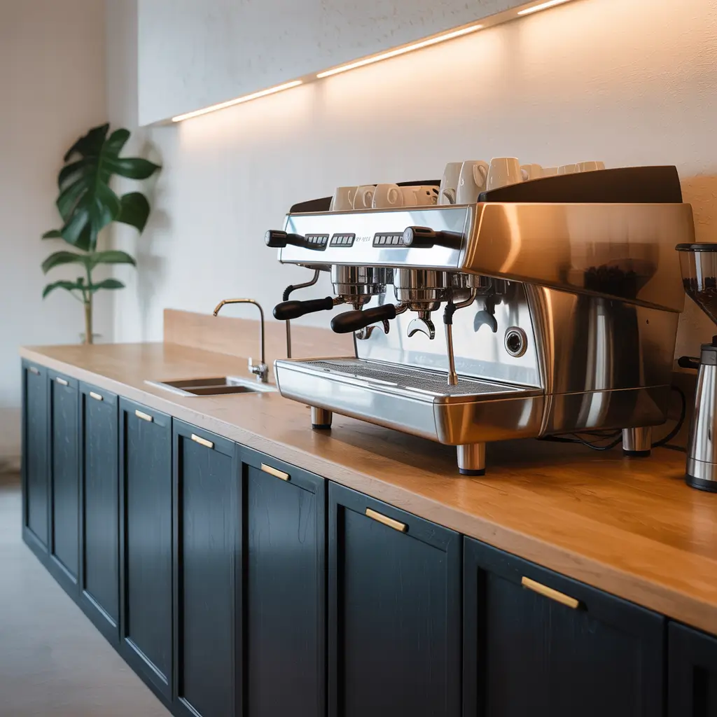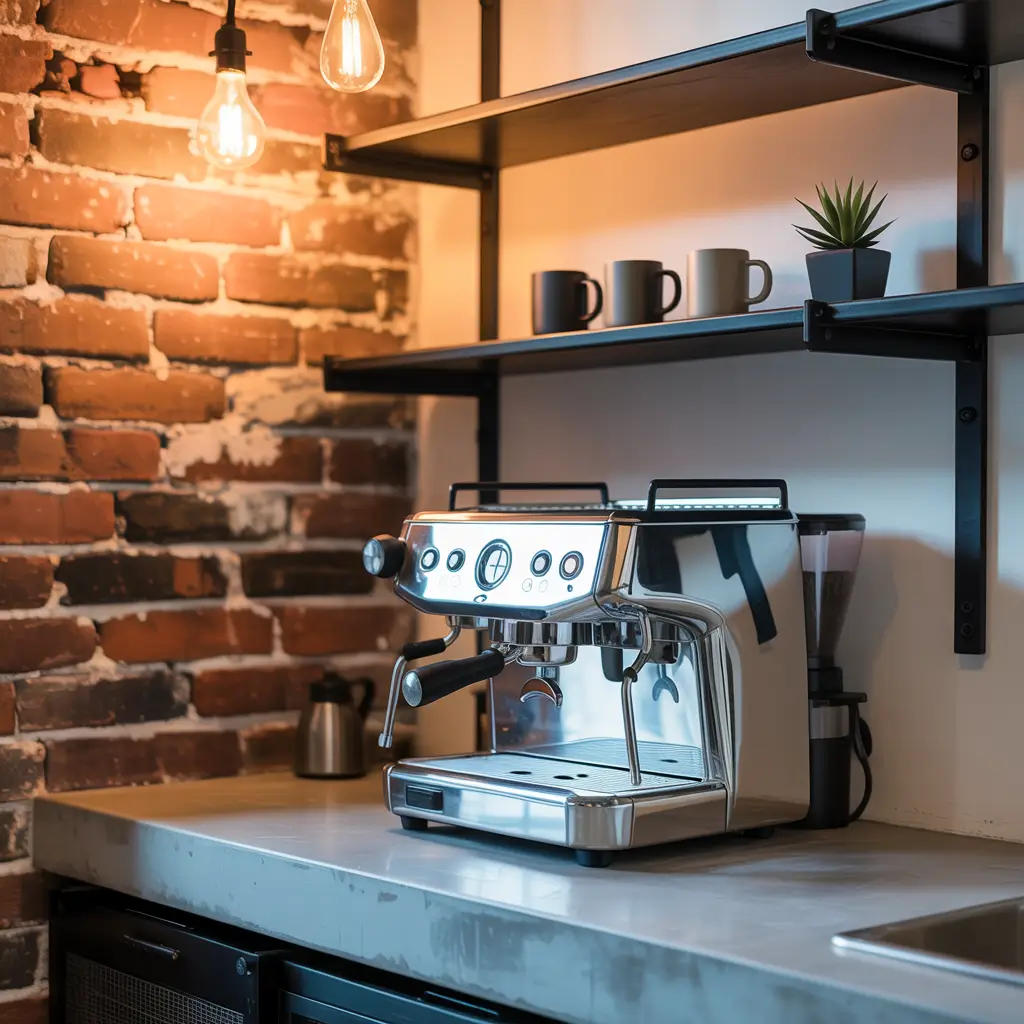 This design marries exposed elements with modern convenience. Think metal piping as shelving supports, concrete or butcher block countertops, and matte black finishes everywhere. Your coffee equipment doesn’t need to hide—it becomes part of the industrial landscape.