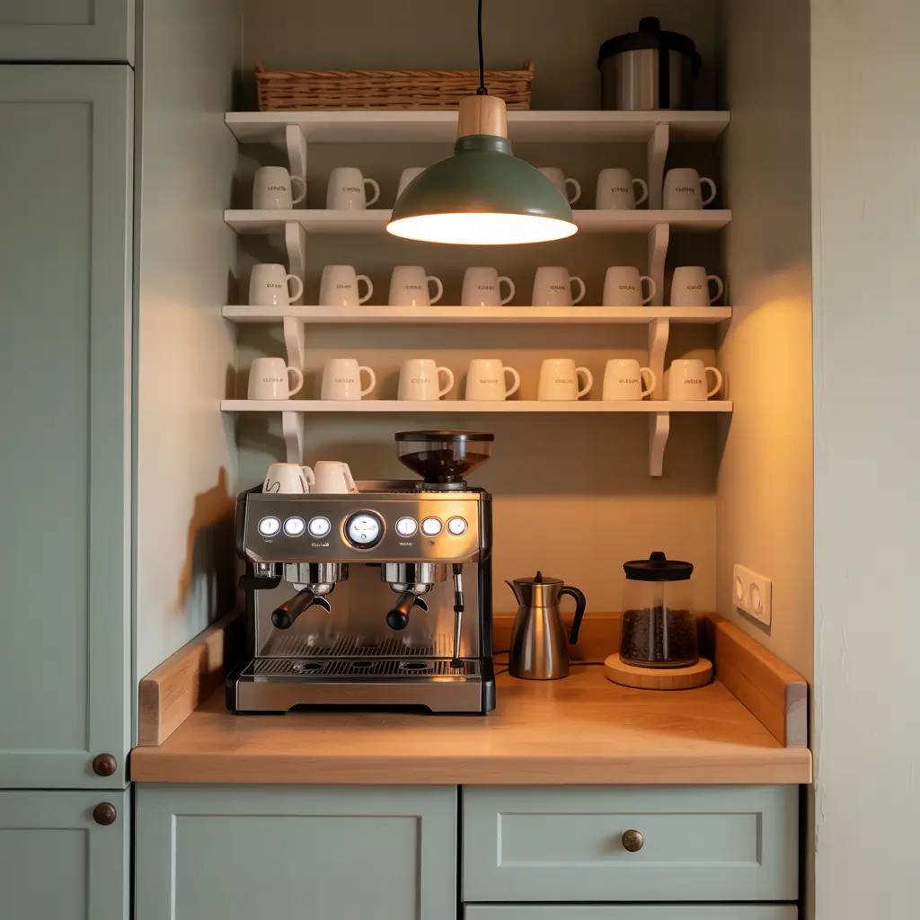 What separates this from plain minimalism? It’s the attention to texture and warmth. Your coffee bar shouldn’t feel clinical—it should feel like a hug in interior design form. I added a small wooden tray to corral my daily essentials, and that simple touch made everything feel more intentional and curated.