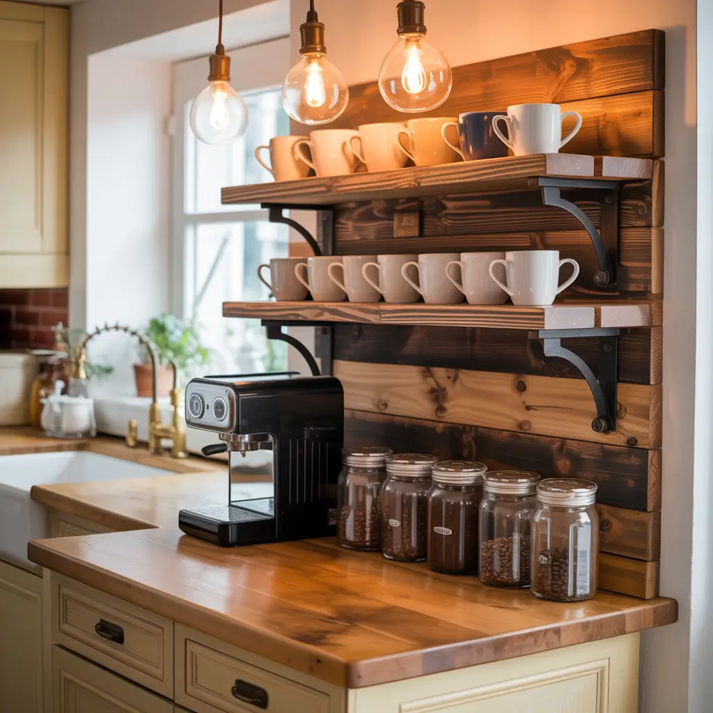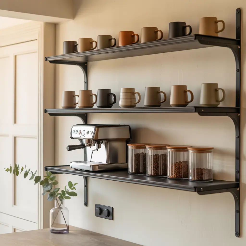 Sometimes floor space is at a premium, or you just want to keep your counters completely clear. Enter the wall-mounted floating coffee shelf—a space-saving solution that looks intentional and stylish rather than like an afterthought.
