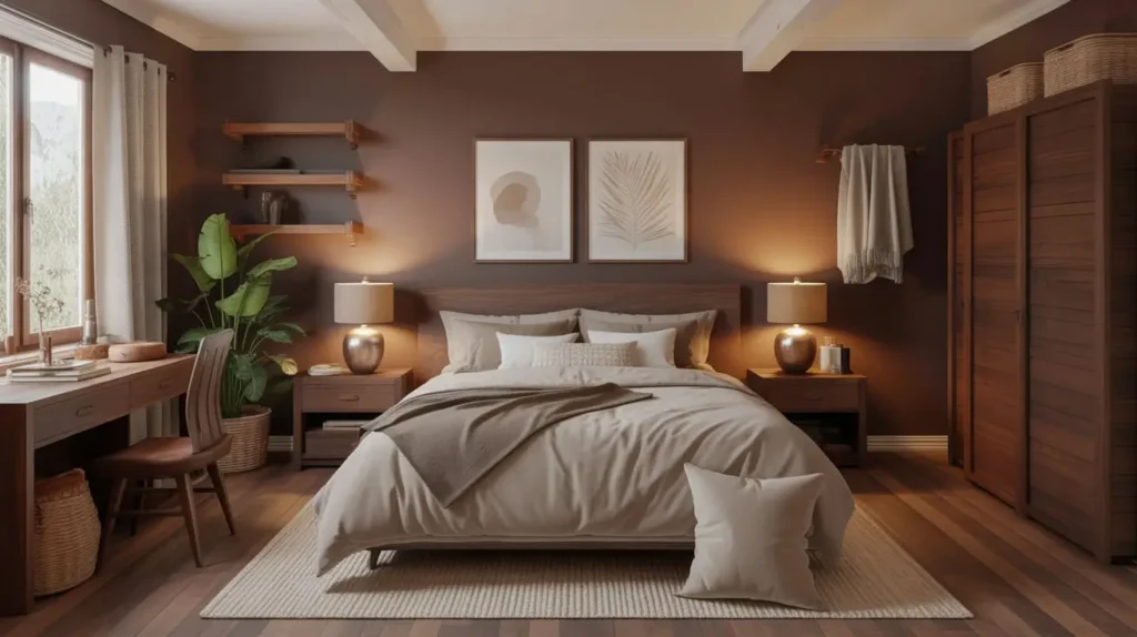 Layer different shades of brown for depth. Deep espresso walls, cognac leather accents, tan linen bedding, and cream curtains create a monochromatic scheme that’s anything but boring. Add warmth through texture—woven baskets, a chunky knit throw, velvet pillows.