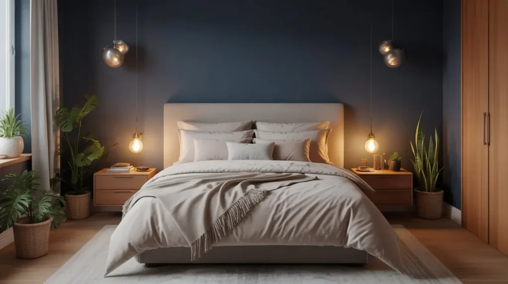 Warm it up with wood tones and ambient lighting. Midnight blue can lean cold, so I’ve added a wooden headboard and warm string lights to create that cozy factor. The combination of cool walls with warm accents creates perfect balance.