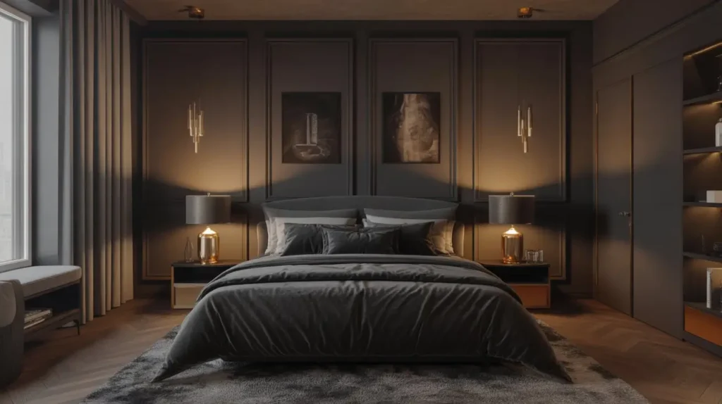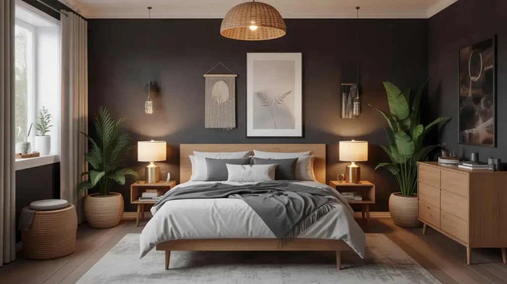 Start with a muted dark base—charcoal, deep taupe, or warm black. Embrace minimalism: low platform bed, minimal nightstands, hidden storage. The Japanese aesthetic values empty space, so resist the urge to fill every corner.