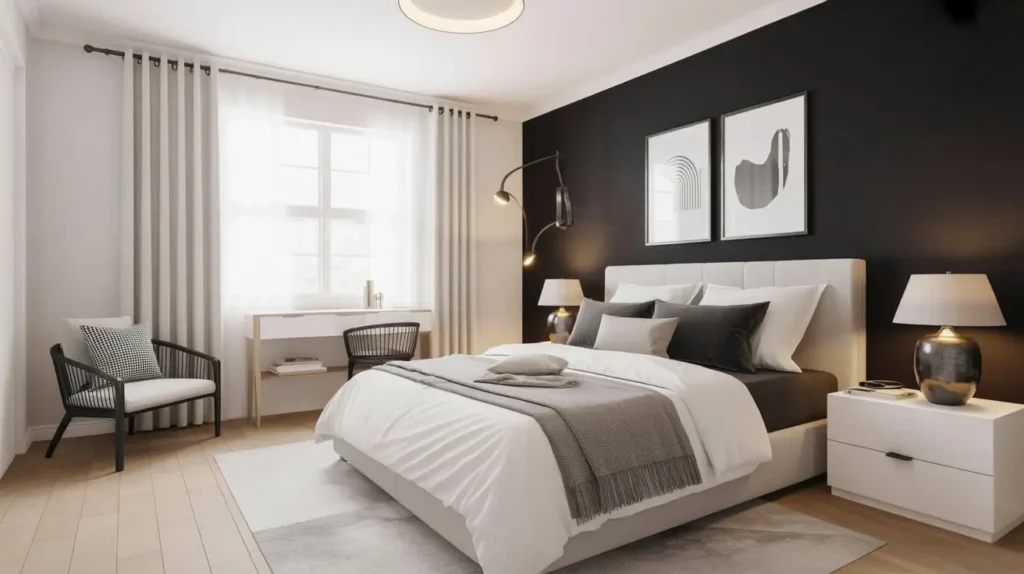 Don’t fear white or light colors. They’re not the enemy. Strategic use of lighter tones creates contrast and prevents your room from feeling like a cave. White bedding, cream curtains, or light wood floors can actually enhance your dark aesthetic rather than detract from it.