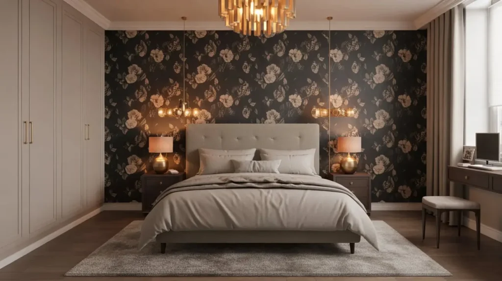 Pull accent colors from the floral pattern. If your wallpaper has burgundy roses and gold leaves, incorporate those colors through pillows, throws, or artwork. This creates cohesion and makes your design feel intentional rather than random.