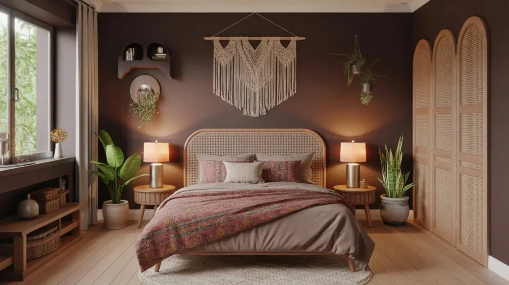 Start with a dark base—charcoal, deep brown, or even black. Then layer in boho elements: macramé wall hangings, patterned textiles, rattan furniture, and lots of plants. The contrast between dark walls and natural textures creates incredible depth.