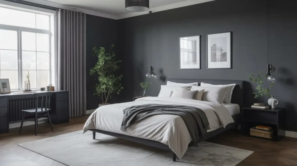 The charcoal minimalist bedroom relies on the “less is more” philosophy, but with depth. Choose a charcoal gray for your walls—something with warm undertones rather than that builder-grade cool gray. Then pare back your furniture to essentials only. A simple platform bed, one or two nightstands, and maybe a sleek dresser.