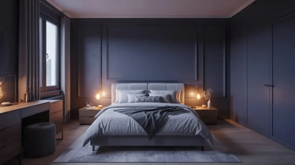 Silver and white accents keep midnight blue from feeling too heavy. Think white bedding with silver embroidery, chrome fixtures, or a silver-framed mirror. These cool-toned accents complement the blue while adding light-reflecting elements.