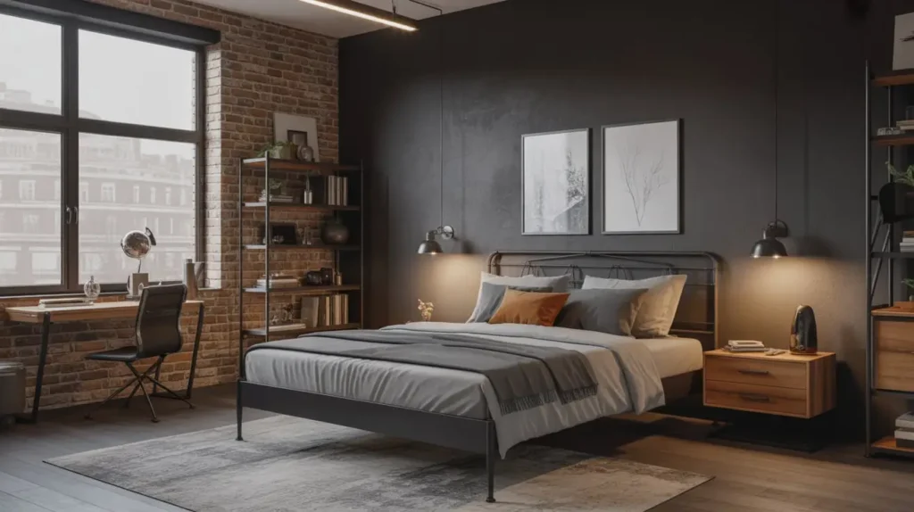 Keep furniture simple and functional. Industrial style doesn’t do frilly. A metal platform bed, a reclaimed wood dresser, maybe some floating shelves made from pipe fittings and wood planks. Everything serves a purpose.